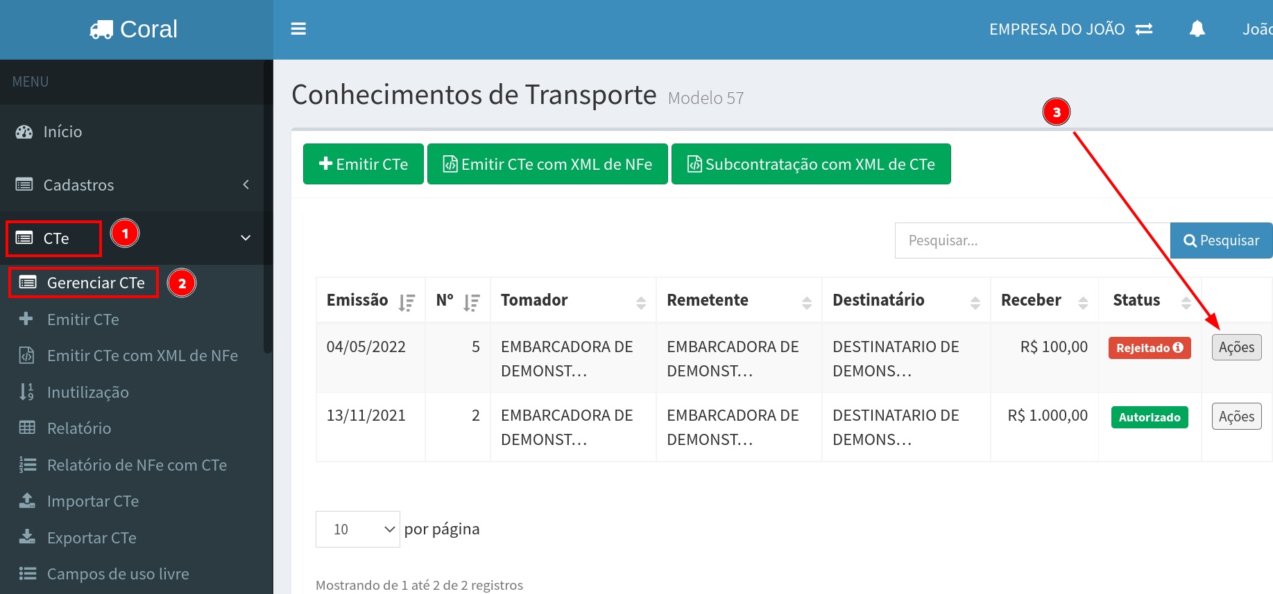 Depois de ajustar a Inscrição Estadual do Destinatário basta reenviar o CTe. Para isso vá ao menu CTe > Gerenciar CTe, então clique em Ações e clique em Reenviar para a SEFAZ, conforme mostra imagem abaixo.