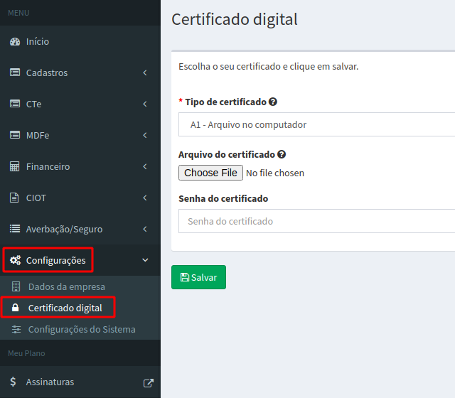 Caso esteja utilizando um certificado digital do tipo A1, verifique o certificado configurado no sistema, no menu lateral em Configurações > Certificado Digital, conforme aponta a imagem abaixo.