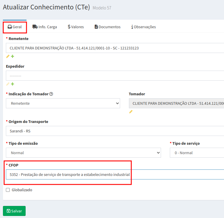 O campo CFOP fica na aba Geral do CTe, conforme mostra a imagem abaixo