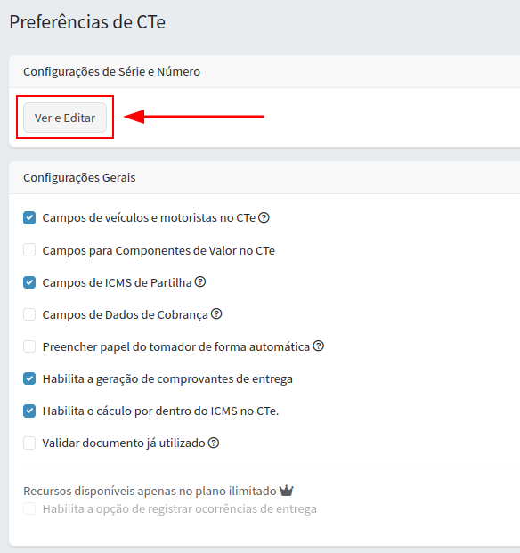 Configure uma nova série ou número de emissão indo até o menu lateral do seu sistema em "CTe > Preferências de CTe":