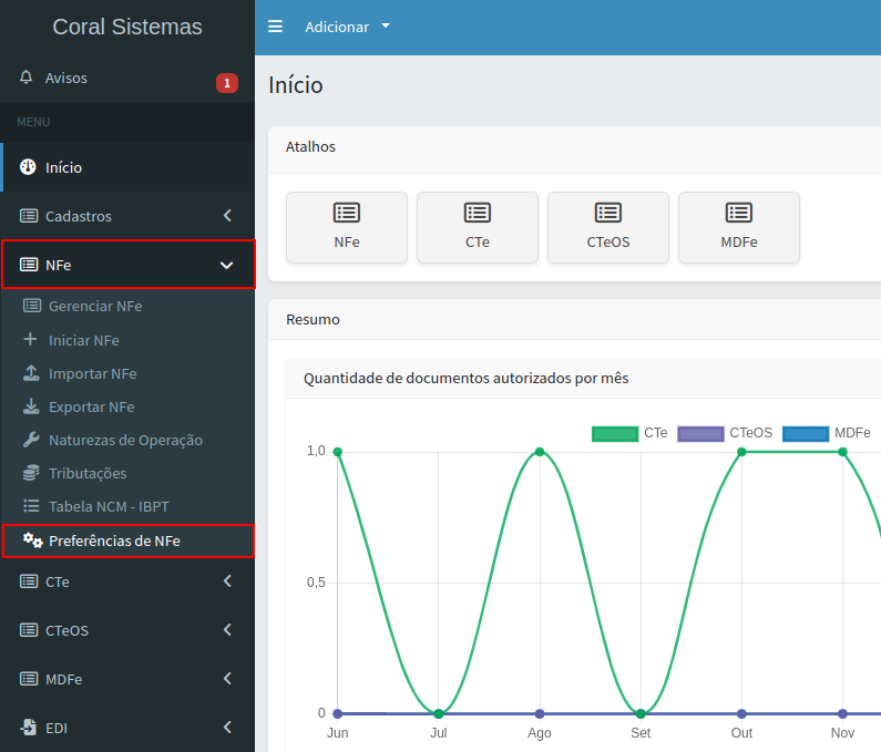 Configure uma nova série ou número de emissão indo até o menu lateral do seu sistema em "NFe > Preferências de NFe":