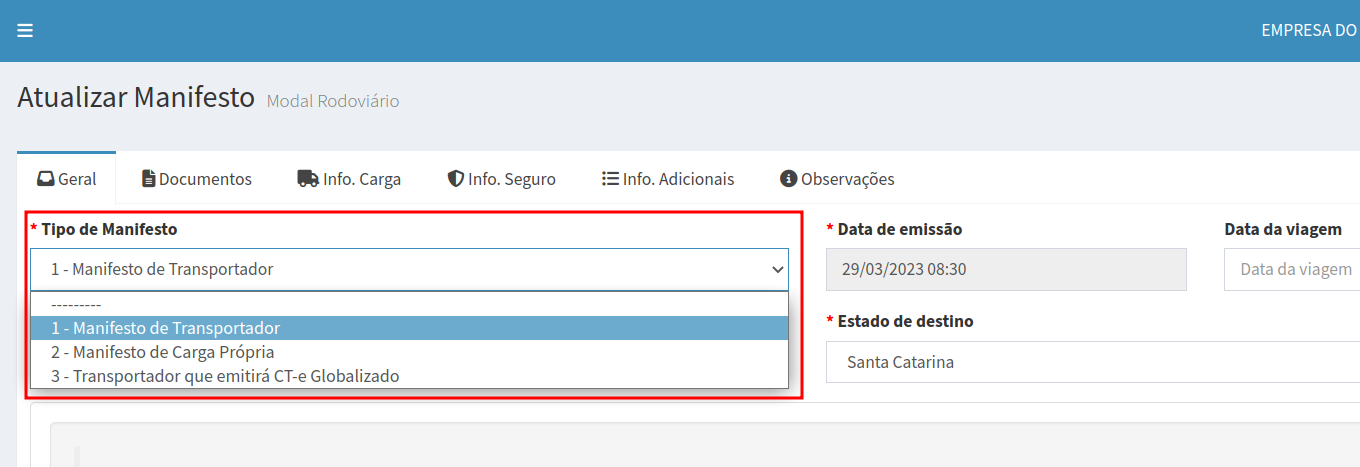 Existem 3 tipos de emissão do MDFe. Um desses tipos é a opção de 3 - Transportador que emitirá CT-e Globalizado. Essa opção de emissão de MDFe só pode ser feita para transportes interestaduais. Caso o transporte seja interestadual ou exterior, então deve usar a opção 1 - Manifesto do transportador, conforme mostra a imagem abaixo.
