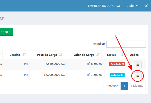 Após encerrado o outro MDFe, basta reenviar o MDFe que está rejeitado. Para reenviar, clica em Ações e clica na opção Reenviar para a SEFAZ.