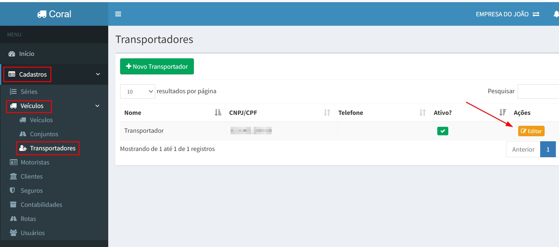 Caso 2: Para o caso de estar usando um veículo de terceiro contratado, precisa ajustar o RNTRC no cadastro do transportador, conforme mostra imagem abaixo.