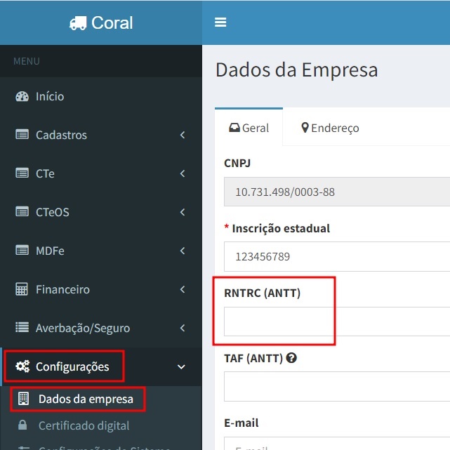 Caso 1: Para o caso de estar usando veículo próprio e não seja um transporte de carga própria então precisa ajustar o RNTRC da sua empresa, ou deixar em branco caso não tenha RNTRC. Para fazer isso vá no menu lateral em Configurações > Dados da Empresa e ajuste o campo RNTRC, destacado na imagem abaixo.