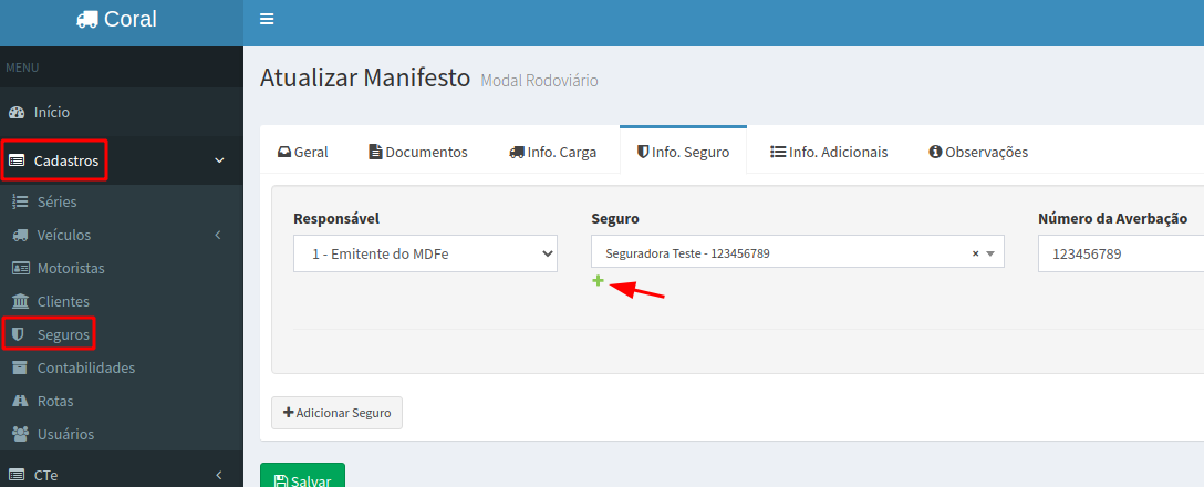 Os Dados da Seguradora e Número de Apólice podem ser cadastrados clicando no sinal de + logo abaixo do campo Seguro (conforme apontado na imagem abaixo), ou pelo menu lateral em Cadastros > Seguros (conforme destacado na imagem abaixo).