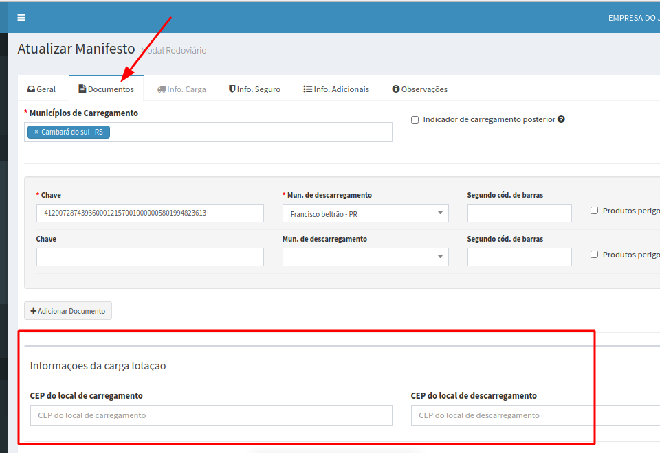Na rejeição 726, a instrução é que as informações da carga lotação devem ser informadas quando o MDFe possui apenas um documento. Ou seja, quando só tem um CTe ou apenas uma NFe no MDFe, é preciso preencher as informações de lotação. Estas informações de lotação se referem ao CEP do local de carregamento e ao CEP do local de descarregamento, que são encontradas na aba de Documentos do MDFe, conforme exemplo da imagem abaixo.