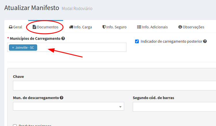 A opção de carregamento posterior só é possível para transporte dentro do mesmo município, ou seja, o município de carregamento deve ser único e igual ao município de descarregamento.
