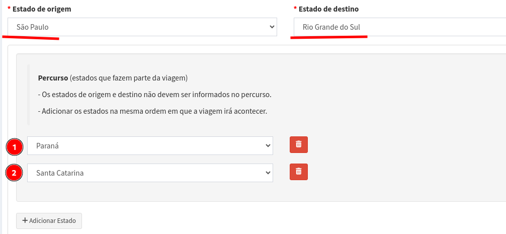 Anteriormente no MDFe era preciso informar o trajeto dos estados que a viagem iria percorrer. No exemplo abaixo uma viagem de São Paulo até o Rio Grande do Sul era preciso informar os estados do Paraná e Santa Cataria.