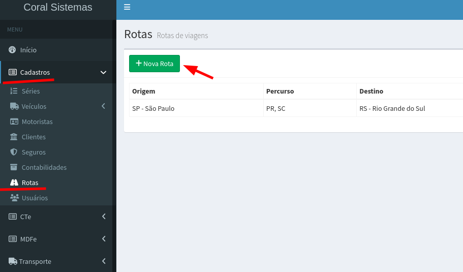 Para cadastrar uma nova rota basta ir no menu Cadastros > Rotas > Nova Rota:
