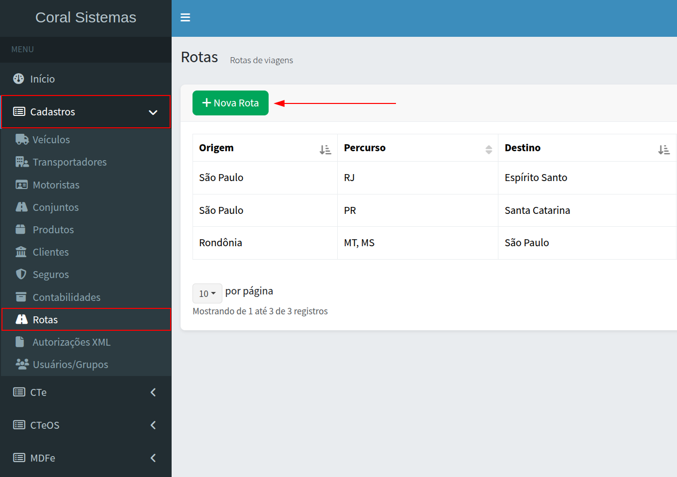 Após preencher o cadastro de rotas, clique no botão ![]()