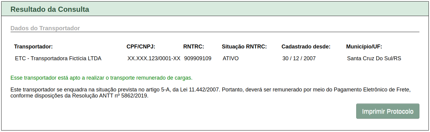 3 – Será exibido o resultado abaixo, onde é possível verificar o RNTRC e a situação do registro.