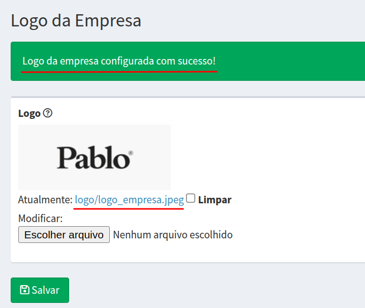 Depois de salvo, o sistema retornará uma mensagem de sucesso, informando que o logo da sua empresa foi configurado.
