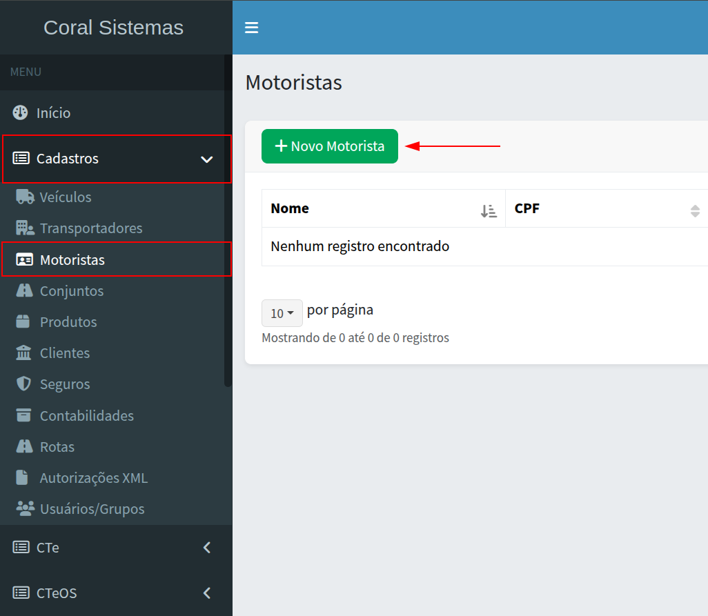 Para alterar algum motorista já cadastrado basta ir no menu lateral em Cadastros > Motoristas.