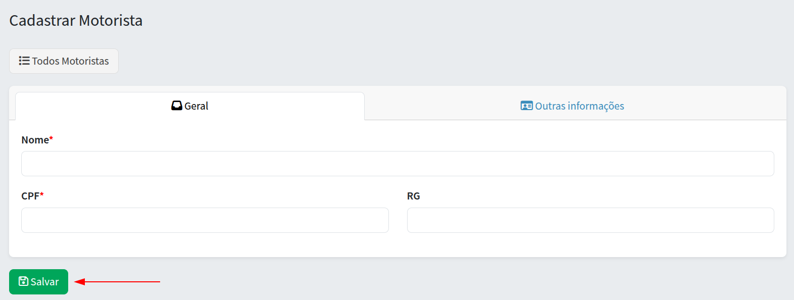 Na tela que abrir irá preencher os dados do motorista. Os campos com asterisco vermelho são obrigatórios.