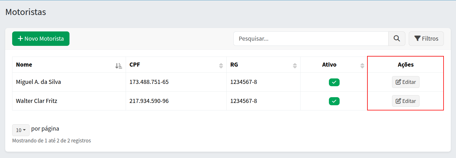 Depois de preencher tudo o que for necessário, clique em Salvar. Se tiver tudo certo, o sistema vai mostrar uma mensagem de sucesso e então vai mostrar uma lista com os motoristas já cadastrados. Se precisar editar o motorista, veja abaixo como fazer.