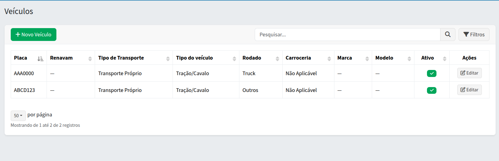 Depois de preencher tudo o que for necessário, clique em Salvar. Se tiver tudo certo, o sistema vai mostrar uma mensagem de sucesso e então vai mostrar uma lista com os veículos já cadastrados. Se precisar editar o veiculo, veja abaixo como fazer.