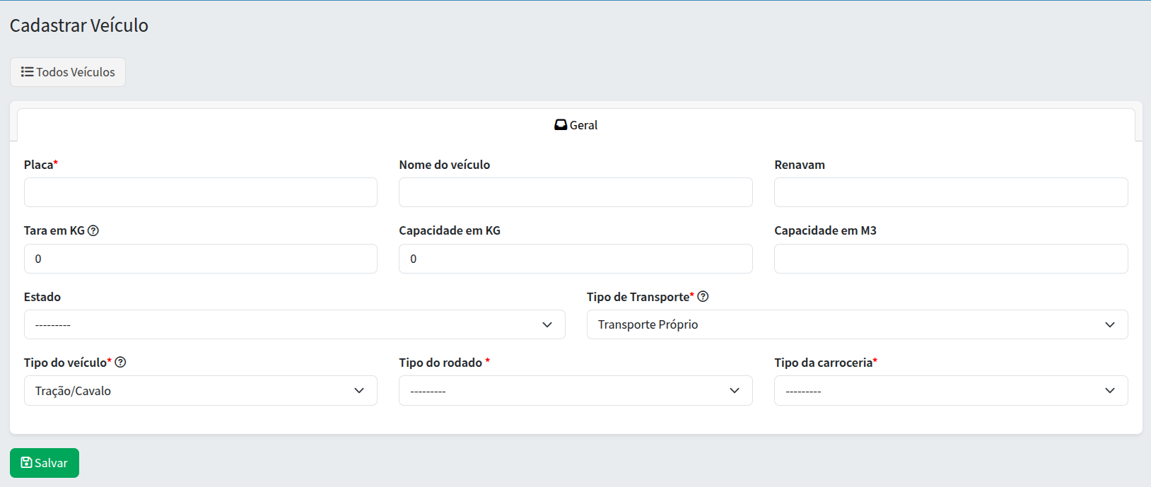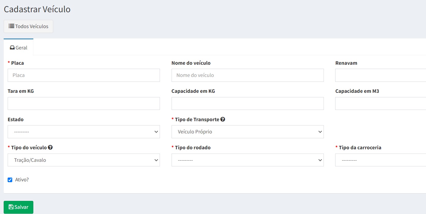 Na tela que abrir irá preencher os dados do veículo. Os campos com asterisco vermelho são obrigatórios.