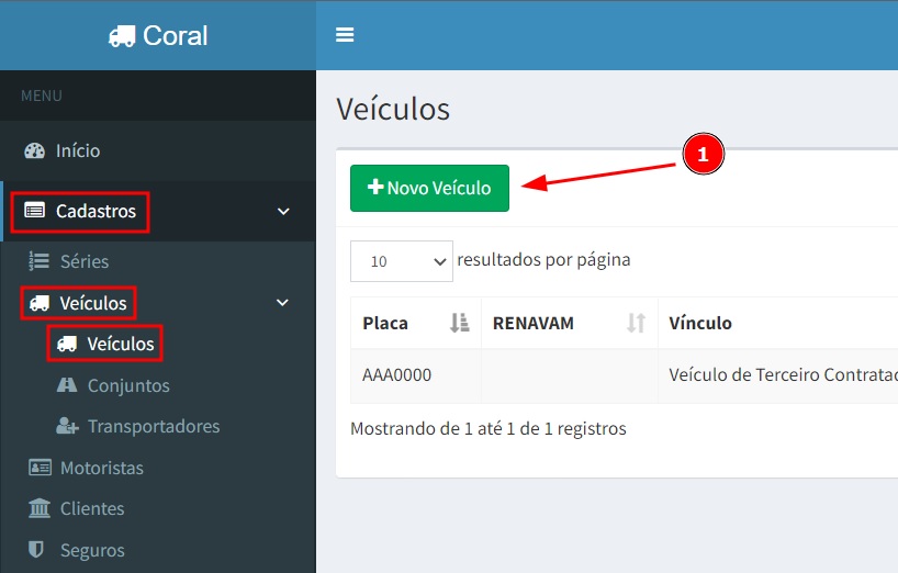Para cadastrar ou editar veículos basta ir no menu lateral em Cadastro > Veículos > Veículos. Nessa tela vai mostrar os veículos que já tem cadastrado e também vai poder cadastrar novos. Para cadastrar um novo veículo clica em +Novo Veiculo (1).