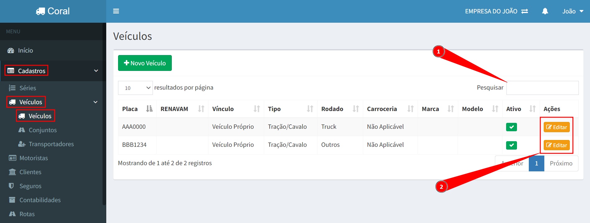 Nessa tela vai mostrar a lista de veículos que já tem cadastrado, pode usar o Campo de Busca (1) para pesquisar algum veículo e então pode clicar em Editar (2) para alterar os dados daquele veículo, conforme mostra imagem abaixo.