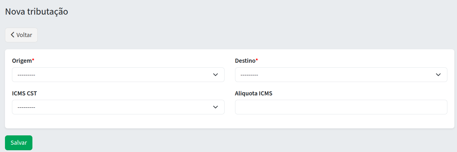 Após clicar em "Nova tributação" será redirecionado para a tela de configuração da tributação.