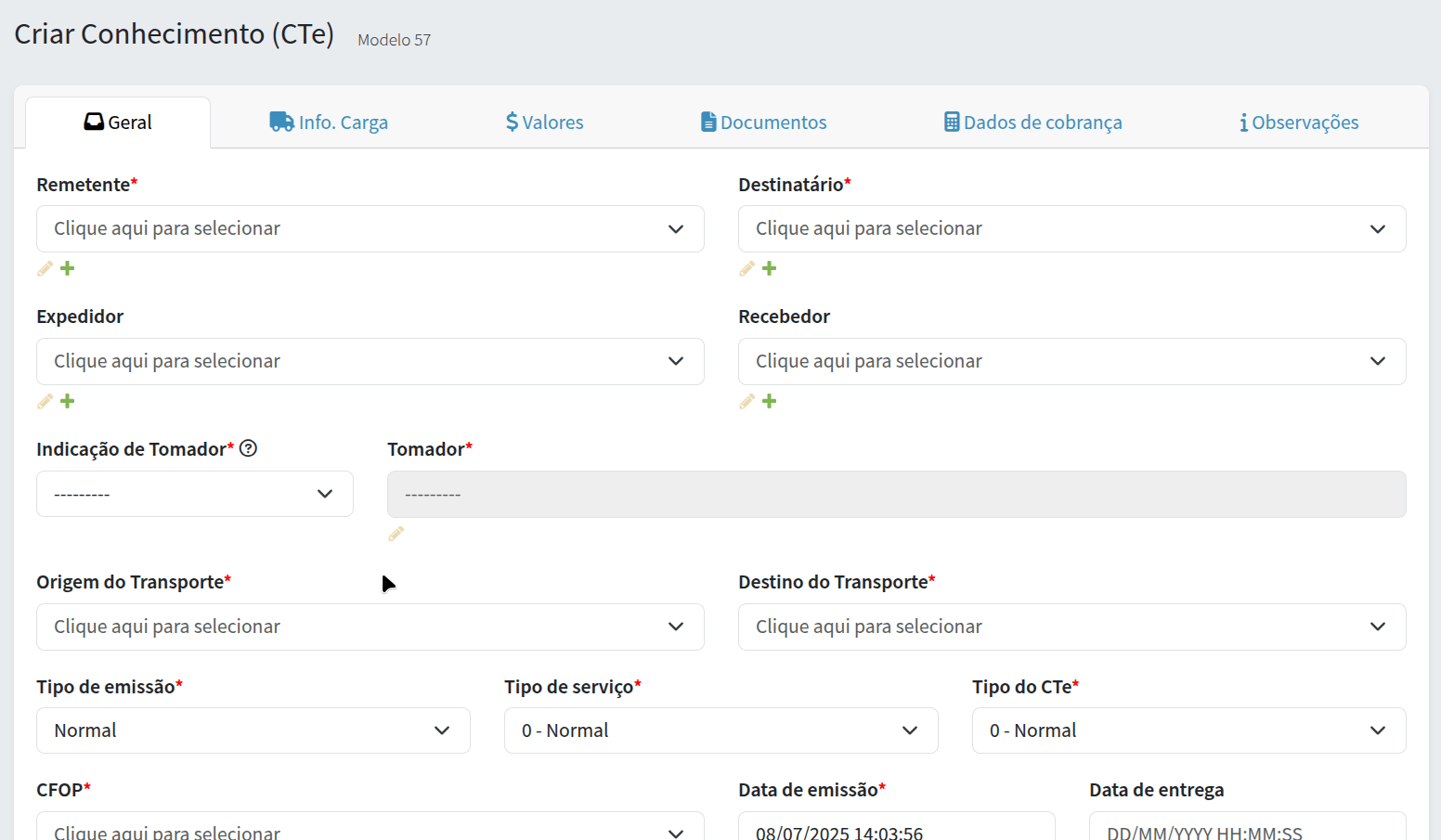 Definido a tributação, ao editar ou iniciar um novo CTe e informar o estado de Origem do Transporte e um estado de Destino do Transporte , as informações fiscais serão atribuídas automaticamente.