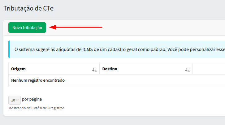Defina um o estado de Origem do Transporte e um estado de Destino do Transporte para a tributação e informe as alíquotas conforme a sua situação tributária.