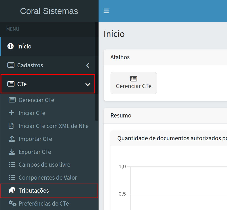 O primeiro passo é ir até o menu lateral em CTe > Tributações