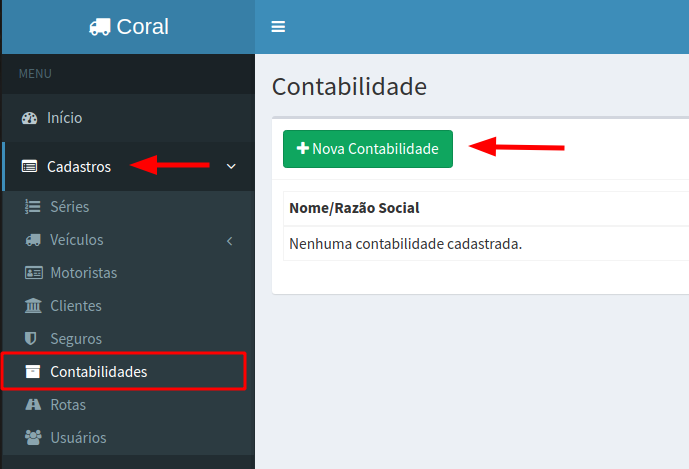 Na tela que abrir vai aparecer um botão chamado Nova Contabilidade. Para cadastrar basta clicar nesse botão, preencher os campos e salvar.