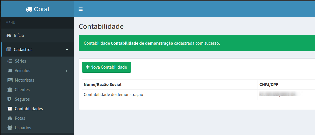 Depois de salvar, vai aparecer uma mensagem dizendo que a contabilidade foi cadastrado com sucesso e ele já vai aparecer na lista de contabilidades, conforme mostra o exemplo da tela abaixo.