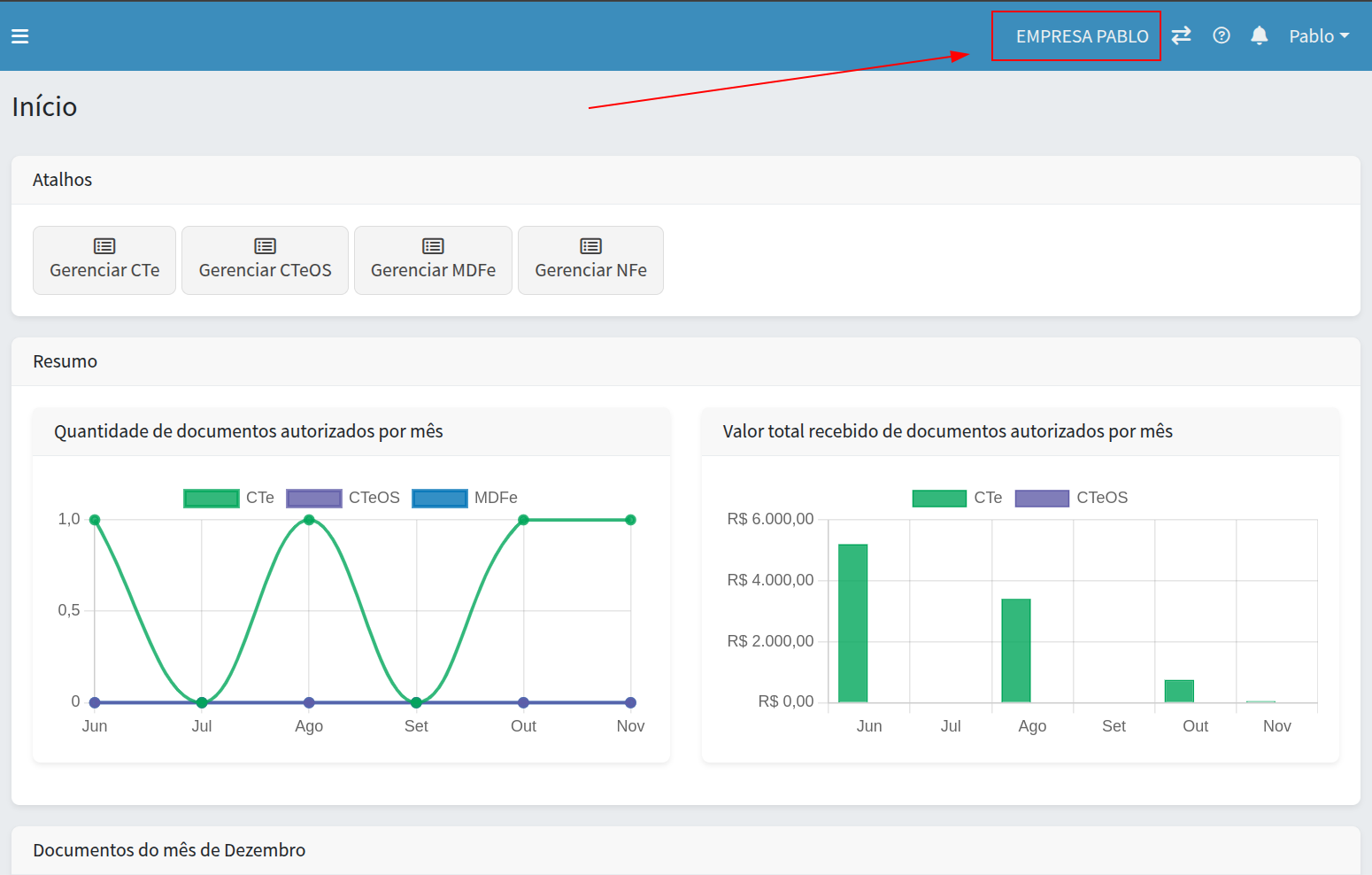 Sempre que precisar trocar de empresa, basta clicar no nome dela (no canto direito superior).