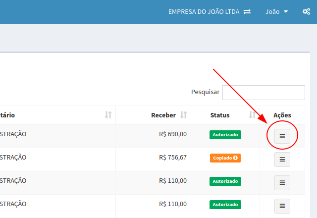 Nesta tela aparecerá todos os CTes que já emitiu. Para cancelar um CTe ele deve estar com o status Autorizado. Nessa lista você vai clicar no botão de ações do CTe que quer cancelar. Conforme exemplo destacado na imagem abaixo