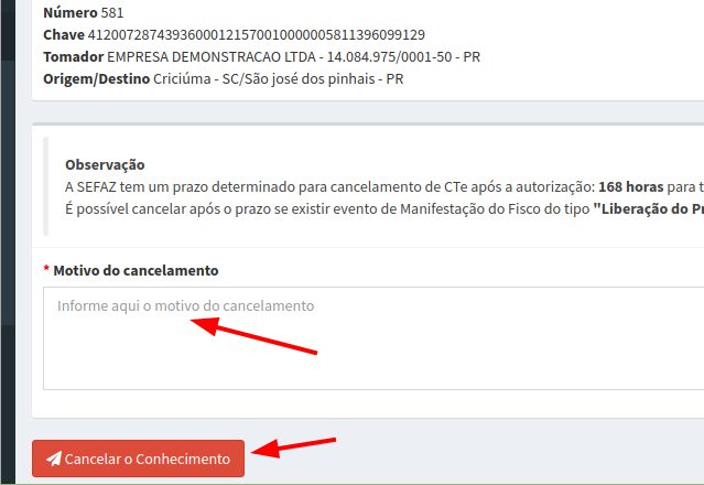 Na próxima tela você vai informar o motivo do cancelamento. É um campo de texto livre onde deve escrever o motivo de estar cancelando o CTe. Depois de preencher o motivo, basta clicar em Cancelar, conforme destacado na imagem abaixo.