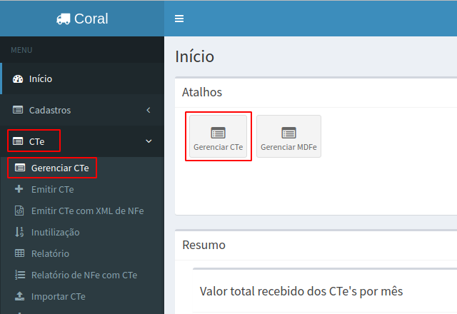 Partindo da tela Inicial do sistema, para cancelar o um CTe, você deve clicar no menu lateral em CTe e depois clicar em Gerenciar CTe ou então clicar no botão "Gerenciar CTe", em atalhos. Na imagem abaixo estão destacadas as duas opções.