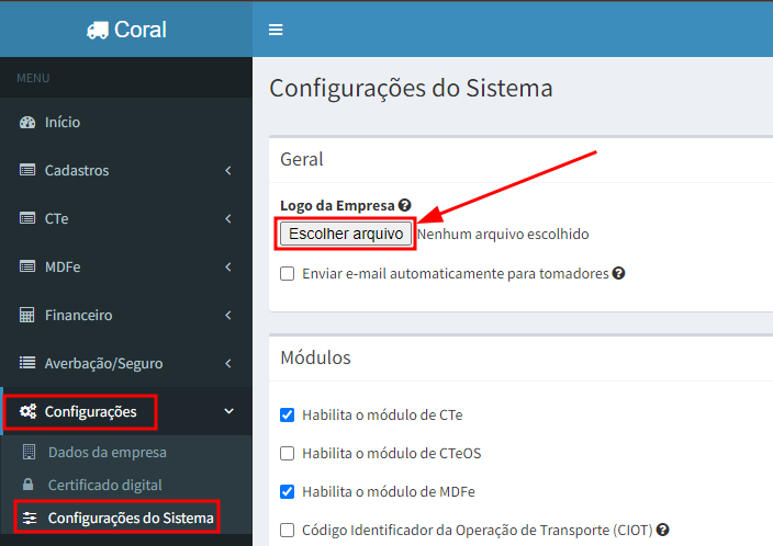 No menu lateral esquerdo, clique na opção Configurações e então clique em Configurações do Sistema, conforme mostra a imagem abaixo.