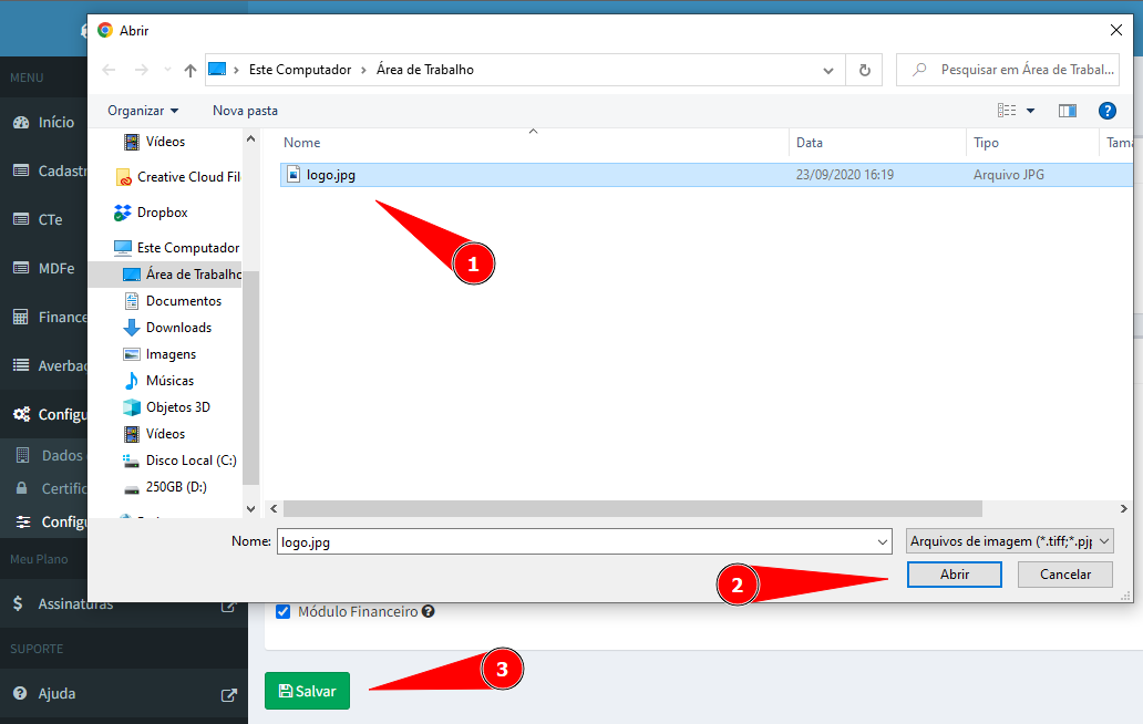 Ao clicar em Escolher Arquivo vai abrir uma janela do seu computador para selecionar o arquivo da imagem da logo. Basta selecionar o arquivo e clicar em Abrir, conforme destacado na imagem abaixo. Depois disso, só clicar em Salvar.