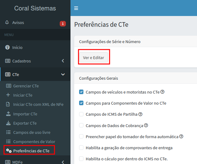 Para criar ou alterar a série e número de emissão, vamos usar neste passo a passo o exemplo do CTe. Lembrando que o mesmo procedimento vale para todos os documentos, seja CTeOS, MDFe ou NFe.