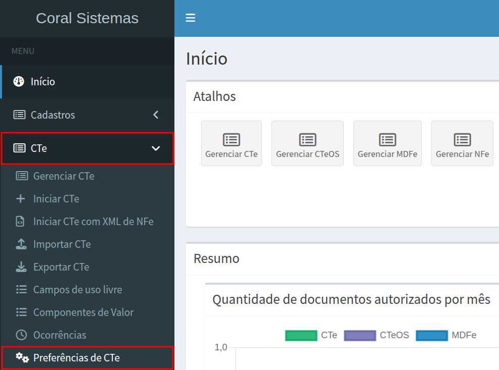 Passo 1: Clique no menu lateral em CTe > Preferências de CTe, conforme mostra imagem abaixo.