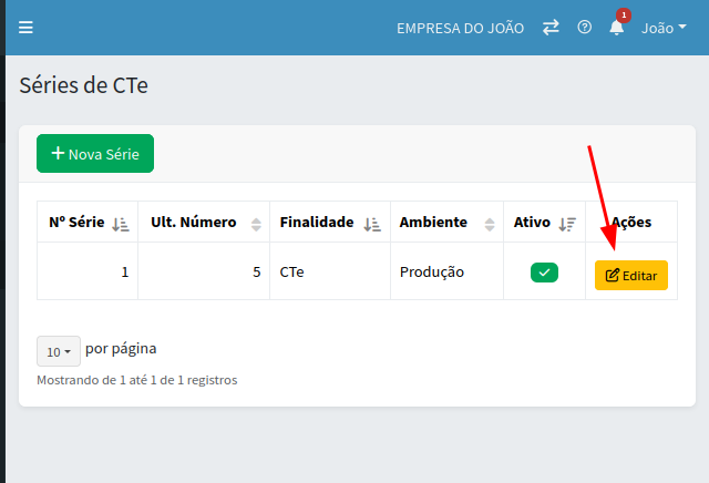 Caso já tenha documentos emitidos e precisa alterar apenas o número, pode clicar em Editar e alterar apenas o campo último número.