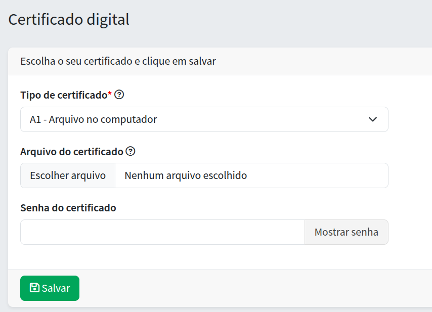 Para os certificado do tipo A1, deve-se escolher a opção "A1 - Arquivo no computador" no campo Tipo do Certificado e então clicar em Escolher Arquivo para selecionar o arquivo do certificado que está salvo no computador. Em seguida vai colocar a senha do certificado no campo Senha do Certificado e clicar em Salvar. Conforme mostra imagem abaixo.