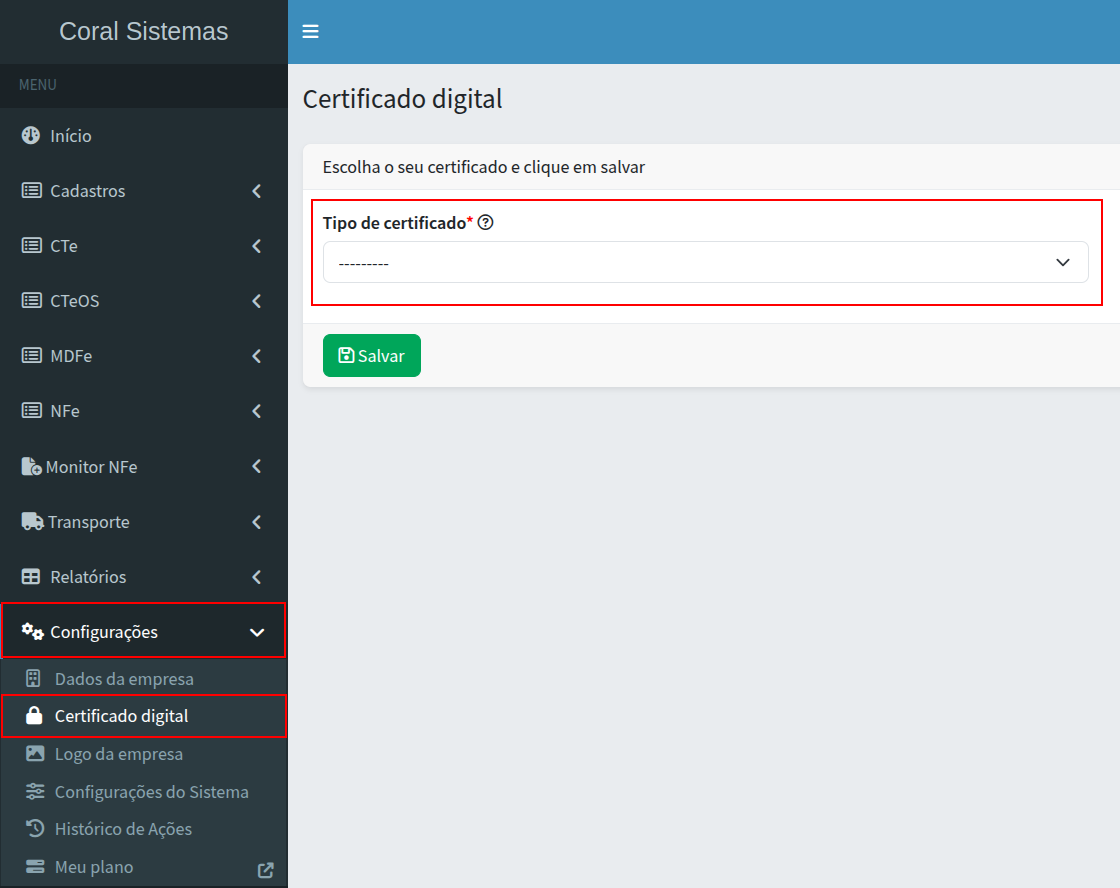 Passo 1: No menu lateral, esquerdo, você deve clicar em Configurações e então em Certificado Digital, conforme mostra a imagem abaixo.