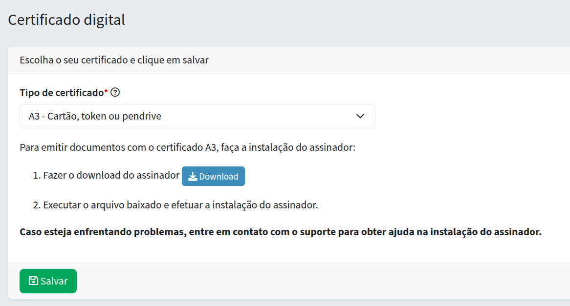 Para os certificados do tipo A3, deve-se escolher a opção "A3 - Cartão, token ou pendrive" no campo Tipo do Certificado. E então clicar no botão de Download para baixar o Assinador Coral Sistemas. Esse programa é o responsável por fazer a comunicação do certificado com o sistema. Pode instalar ele e então clicar em Salvar. Conforme mostra a imagem abaixo