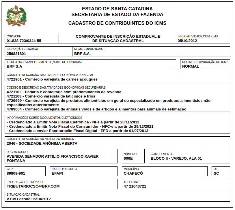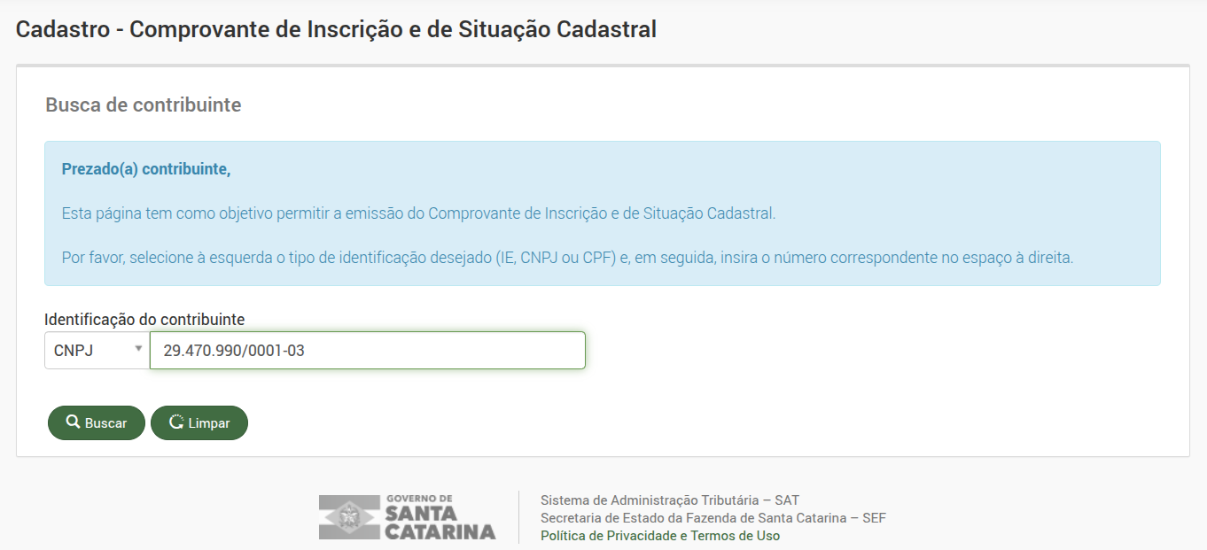 - Exemplo para Consulta no Estado de Santa Catarina (SC) usando o CNPJ: