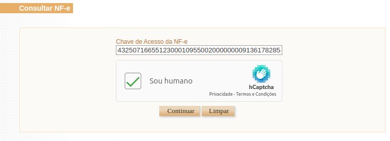 3 – Informe a Chave de Acesso da NFe ou CTe, o código que aparece na imagem e clique em Continuar: