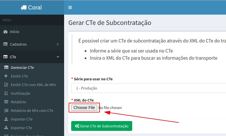 2º Passo: Na tela que abrir, clique em Escolher Arquivos, conforme apontado na imagem abaixo. Selecione o arquivo XML do CTe que está salvo no seu computador e clique em Abrir. Depois basta clicar em Gerar CTe de Subcontratação