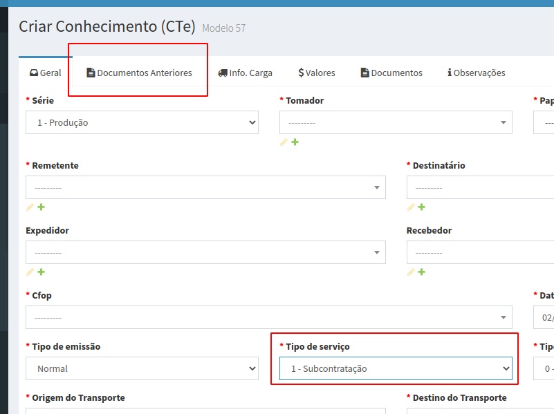 2º Passo: Após clicar em Emitir CTe, irá abrir a tela de preenchimento do CTe. Para fazer um CTe do tipo Subcontratação você deve mudar o campo "Tipo de Serviço" para a opção "1 - Subcontratação", conforme mostra a imagem abaixo. E então na aba Documentos Anteriores vai informar os dados da transportadora que lhe contratou e a chave de acesso do CTe que eles emitiram.