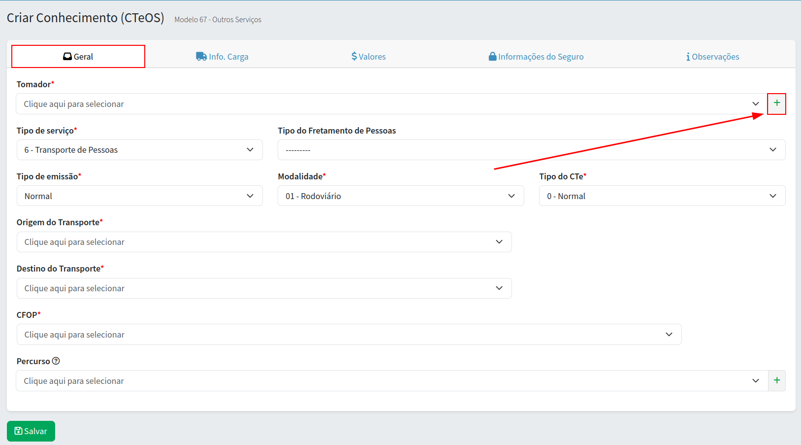 Caso o tomador não esteja cadastrado você pode clicar no sinal de adição ( + ), verde, para cadastrar um novo cliente.