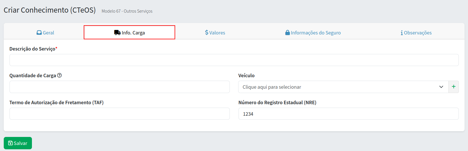 Passo 3. Depois de preencher os campos da aba Geral, agora pode clicar na aba "Info. Carga", conforme mostra a imagem abaixo. Nesta aba são informações sobre a carga (produtos e valores da carga)