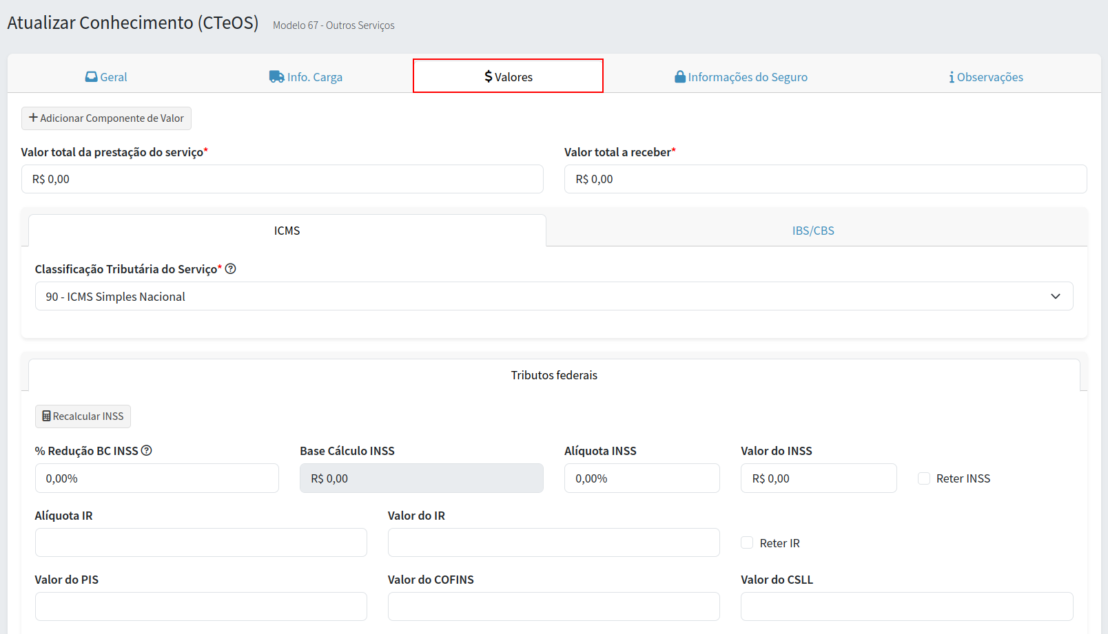 Passo 4. Agora vamos para a aba "Valores", conforme mostra na imagem abaixo. Nessa aba serão preenchidos os valores do serviço.