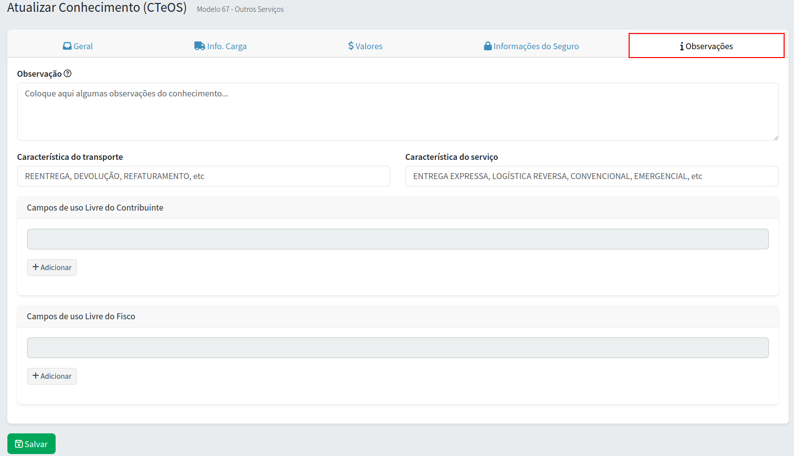 Ao clicar em Salvar, se estiver faltando alguma informação, o sistema vai mostrar uma mensagem na cor vermelha ou até mesmo vai dar um destaque para o campo que está faltando preencher. Caso esteja tudo certo, vai aparecer uma mensagem, em verde, dizendo "CTeOS salvo com sucesso".